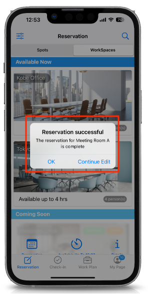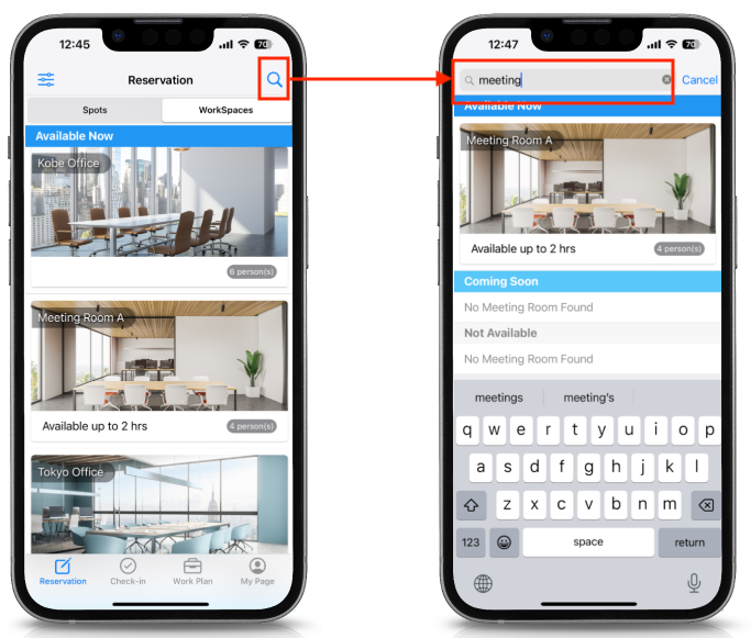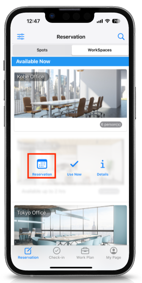 Open Acall Mobile app and find the meeting room or equipment you want to reserve from the list of workspaces in the [Reservation] menu.