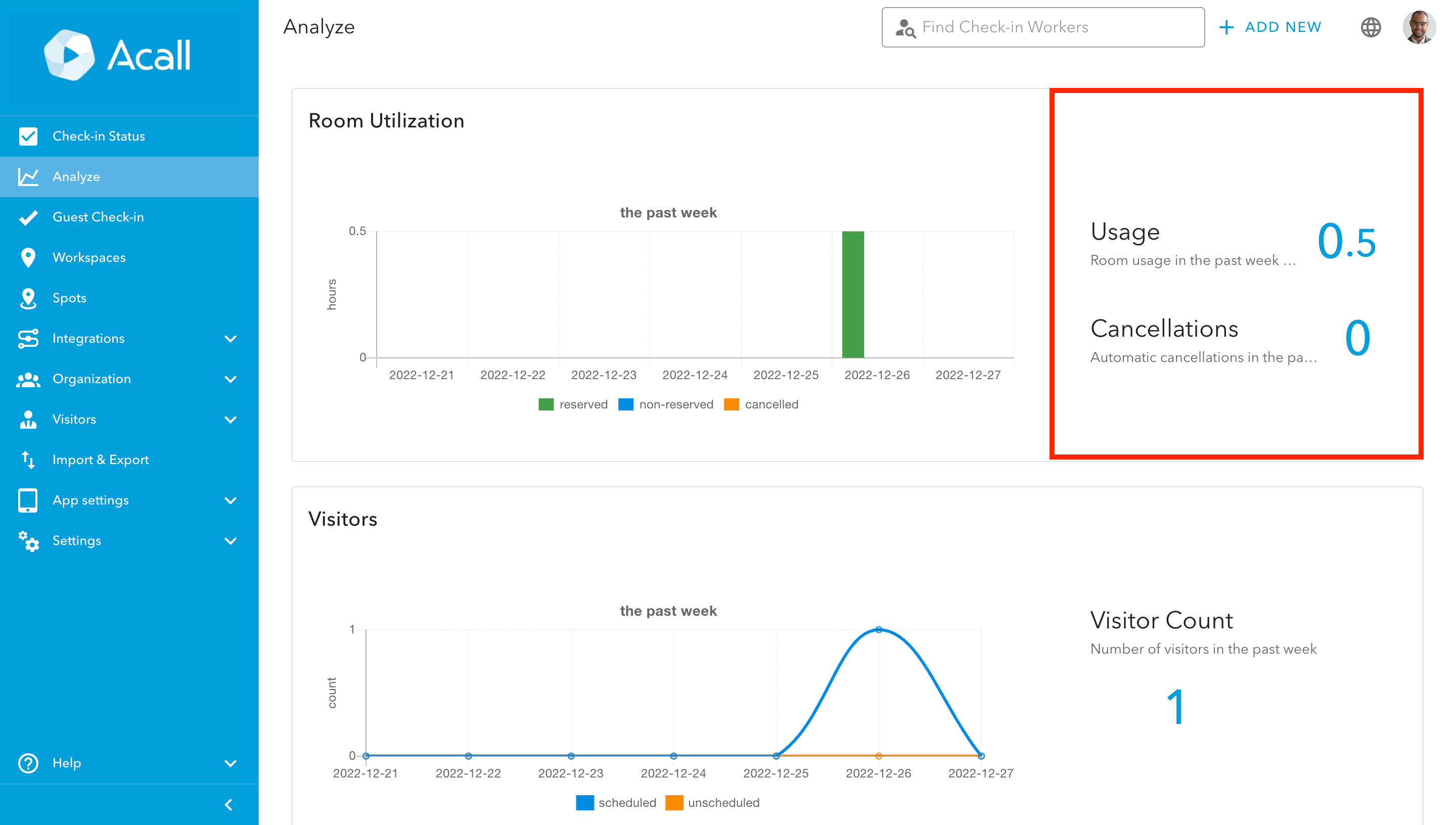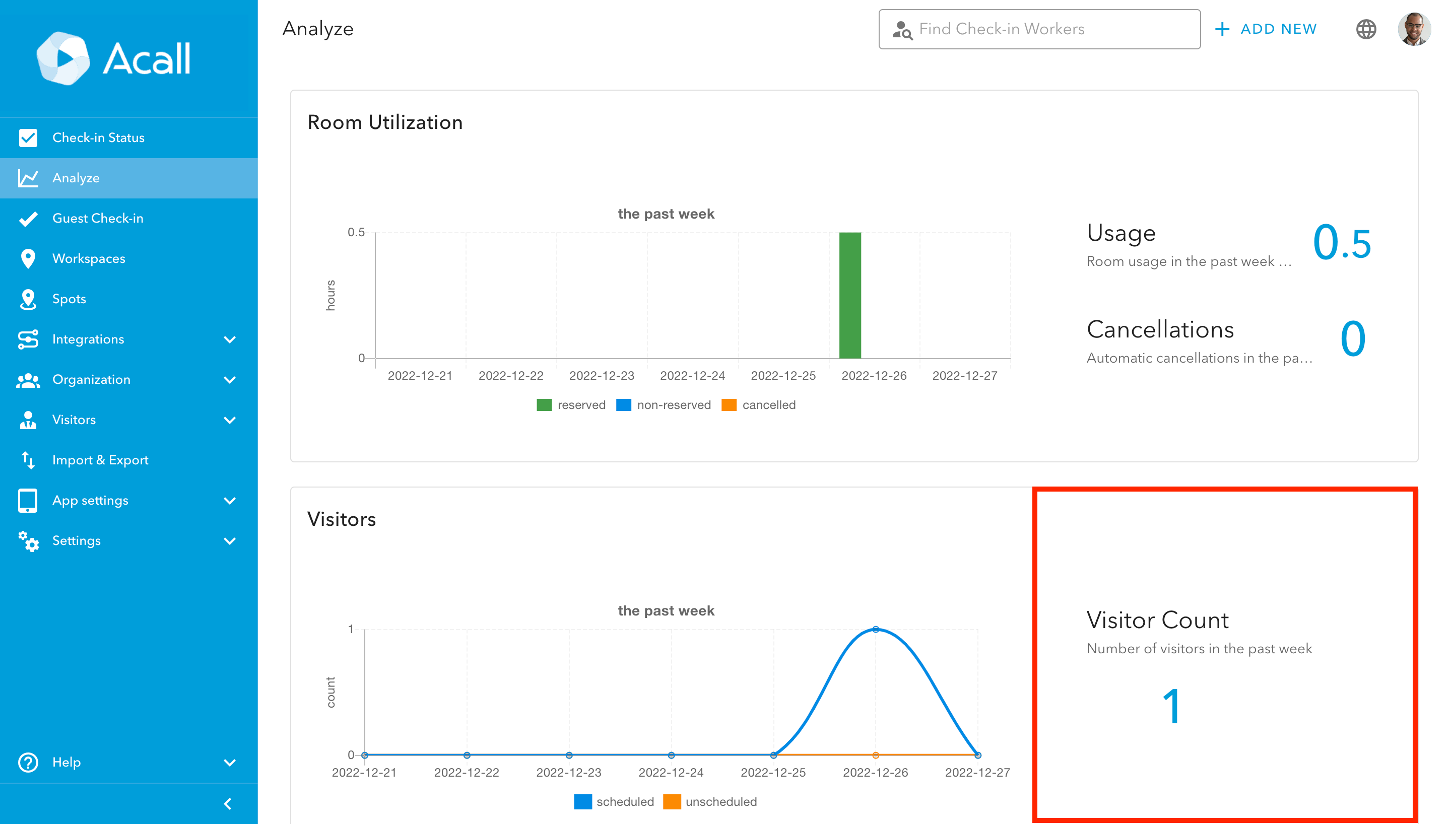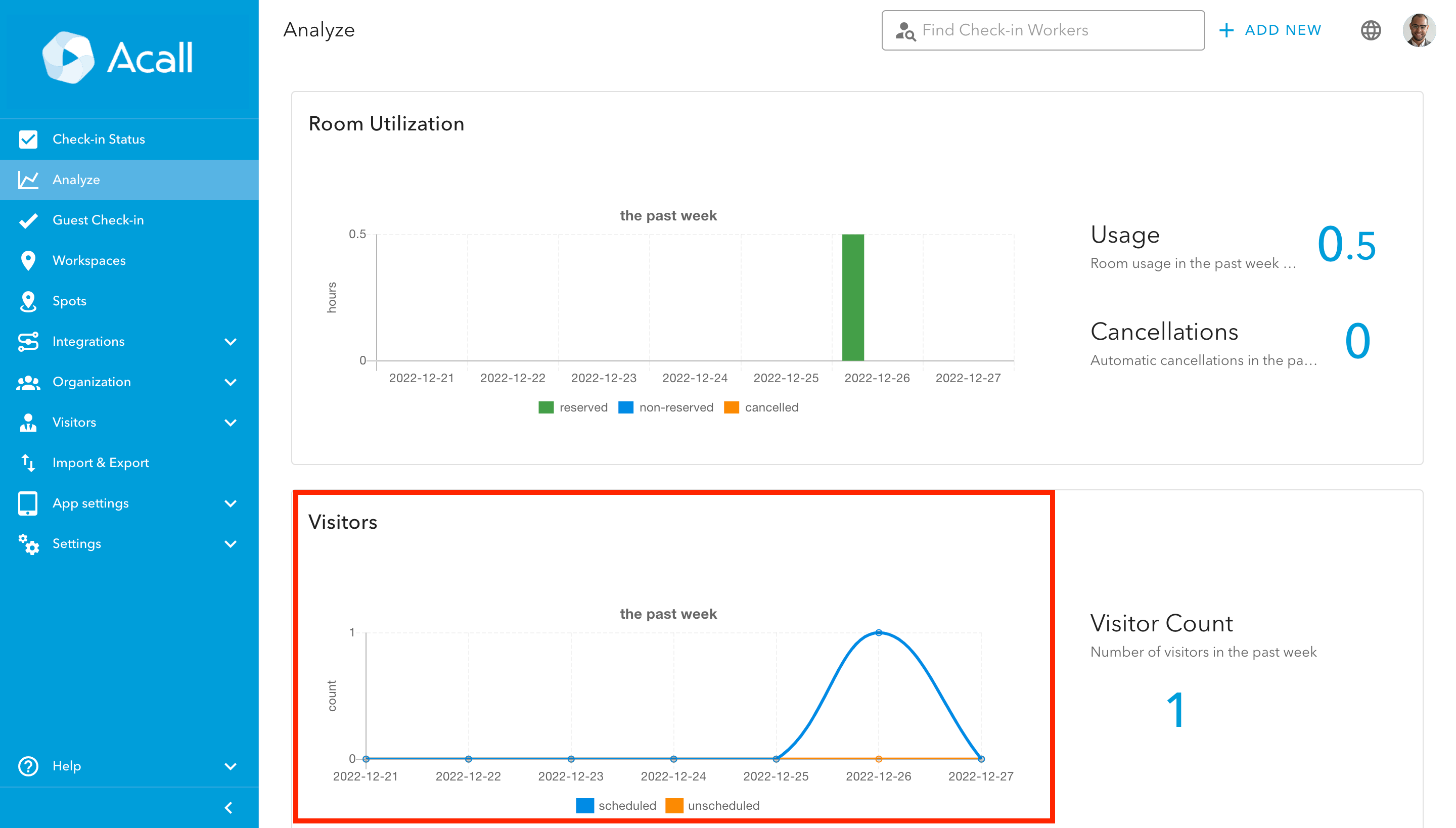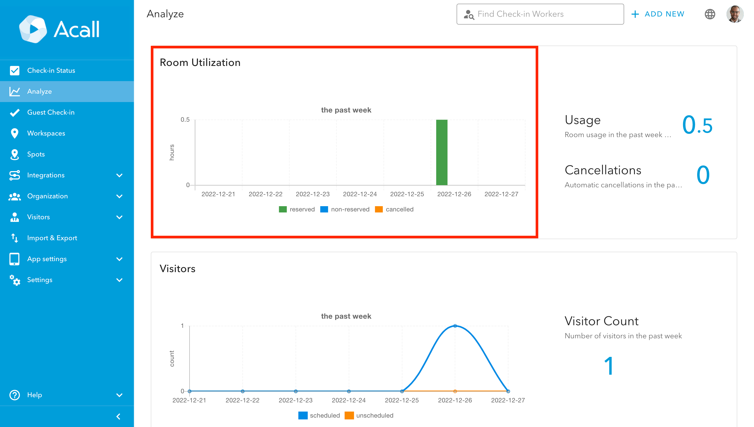 On the analyze screen, you can find the meeting room utilization and the number of visitors for the past week on a graph.