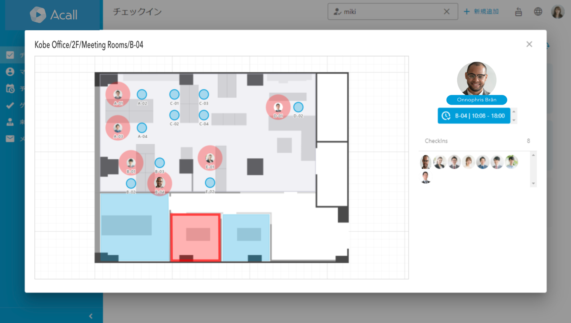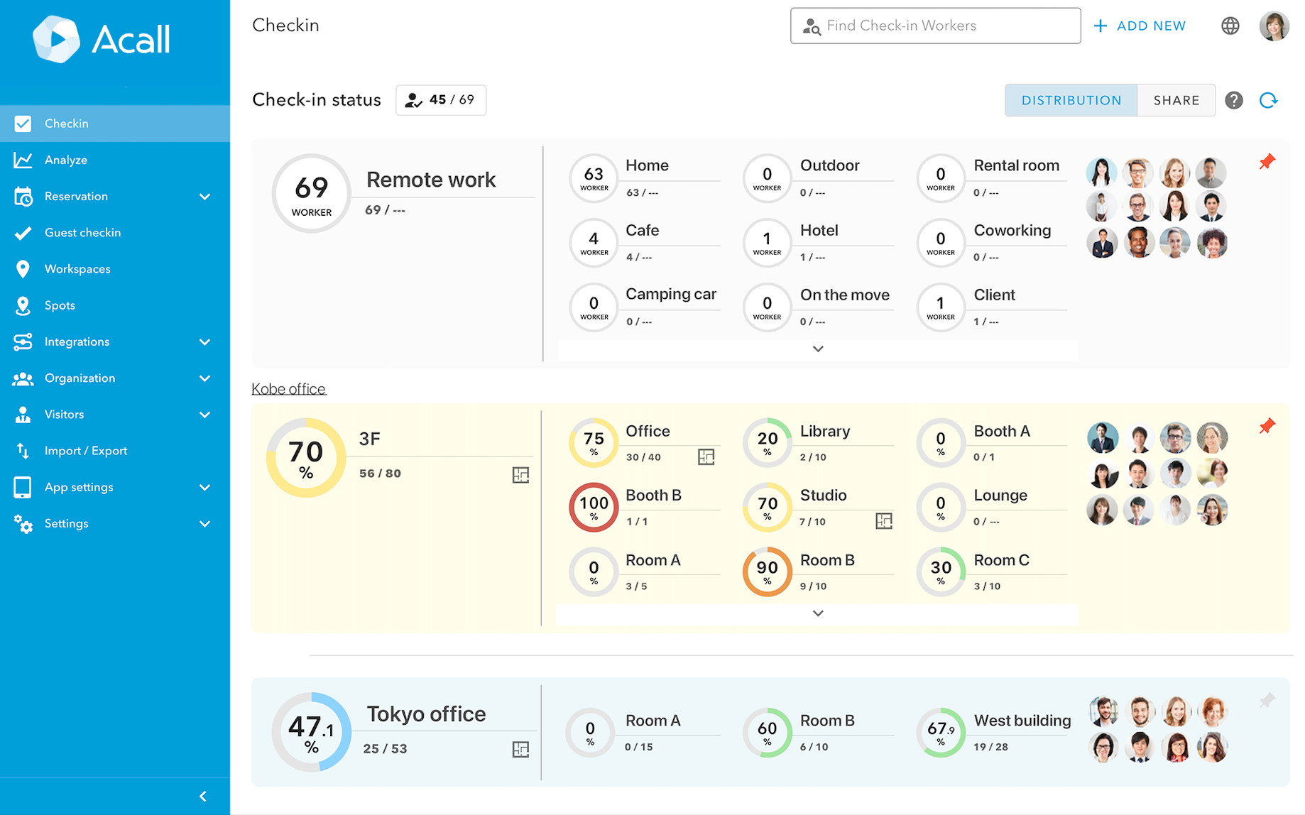 You can register workers, check their schedules, reserve seats and meeting rooms, make appointments, etc., and share information such as "who" of team members is working "where" on Acall Portal.