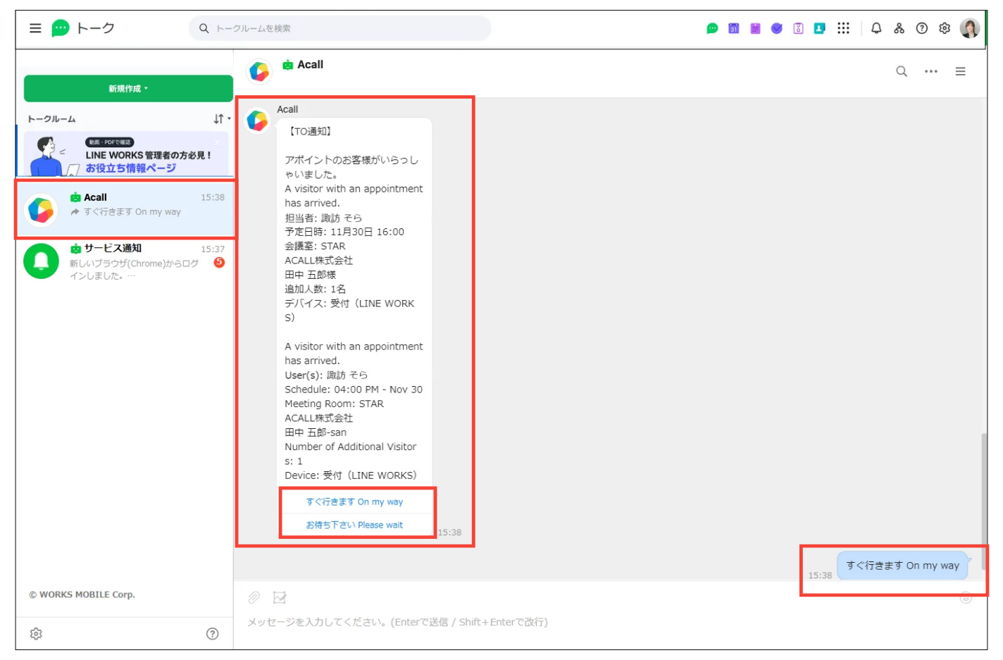 LINE WORKS で来訪通知を受け取る