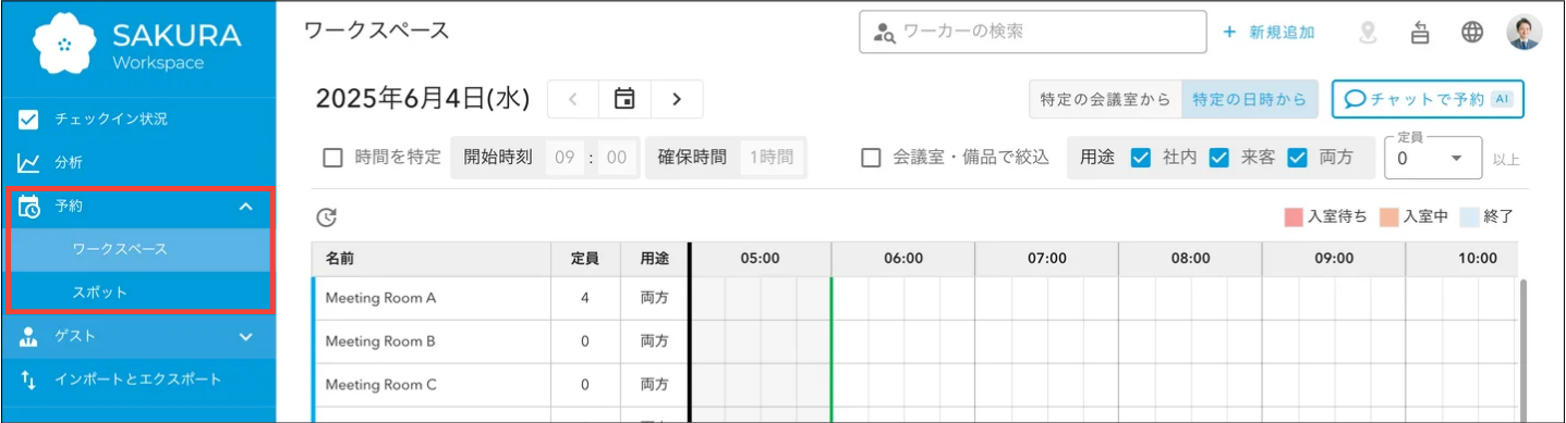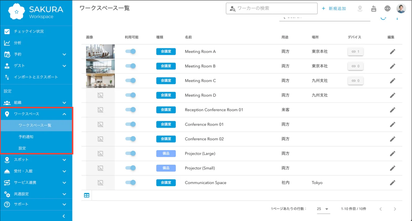会議室チェックイン機能では、予約の対象となる会議室・備品などをワークスペースと呼びます。