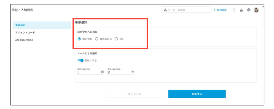 Acall Reception は来訪通知の詳細設定ができ、ワーカーに合わせた来訪通知の方法を選ぶことができます。総合受付への通知やメール通知の有無、来訪通知の再送回数、再送間隔の設定方法をご紹介します。